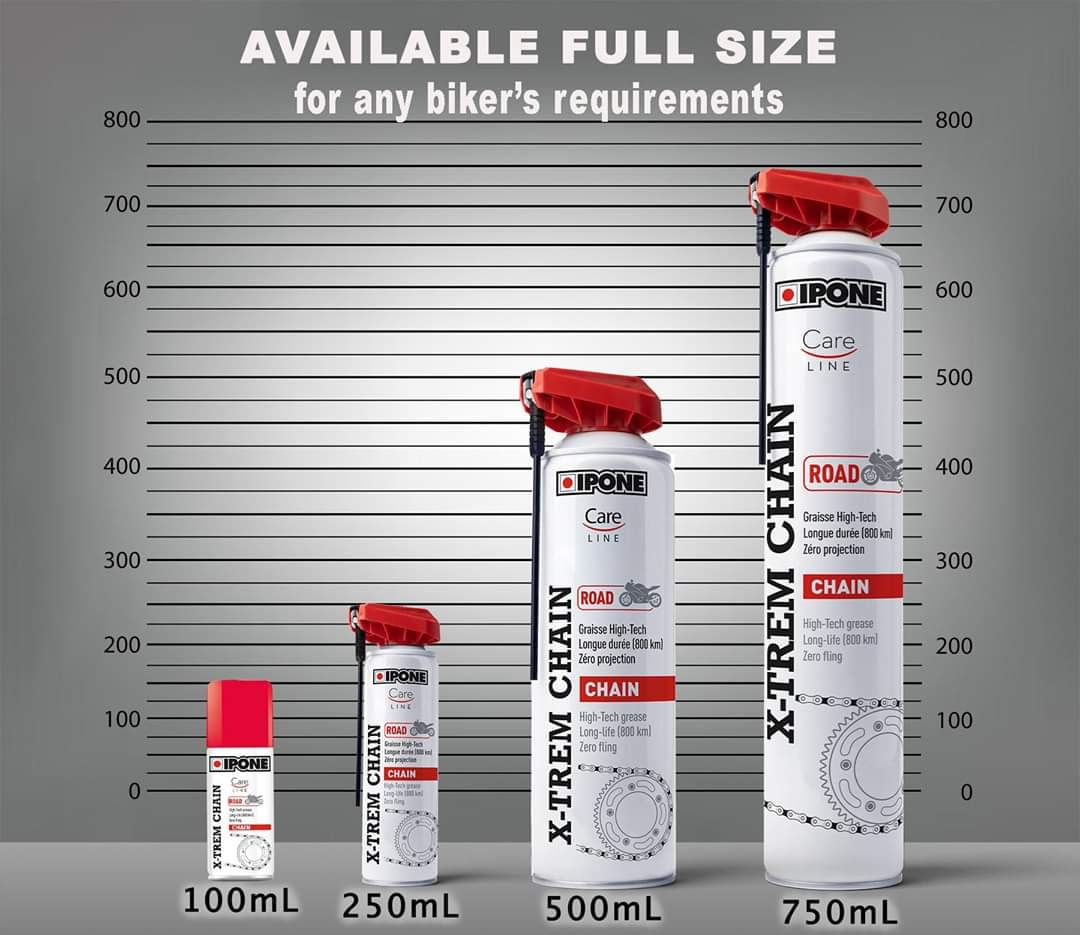 IPONE X-TREM CHAIN ROAD is a high-performance chain grease. Thanks to its high-tech calcium sulfonate formula, it holds perfectly to your chain up to 800 km, even in wet environments.