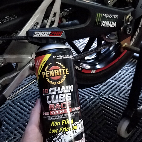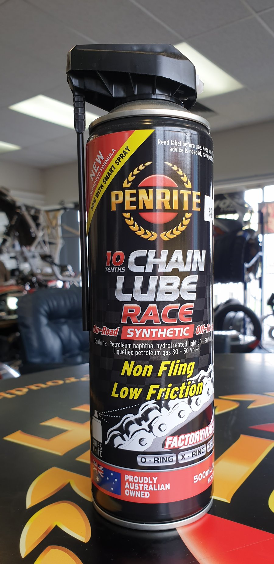 PENRITE 10 TENTHS CHAIN LUBE RACE is designed for use in competition, road and off road applications that use a chain drive system such as motorcycles, ATVs and Go-Karts etc. It can also be used on bicycle chains. It contains advanced lightweight synthetic additives that penetrate chain links, rollers and sprockets, leaving a thin film of highly protective lubricant within the chain. The synthetic grease like lubricant is not as dense as standard chain lubes but provides equal protection to much thicker lubricants which can fling off the chain or attract large amounts of dirt and mud in off road conditions.