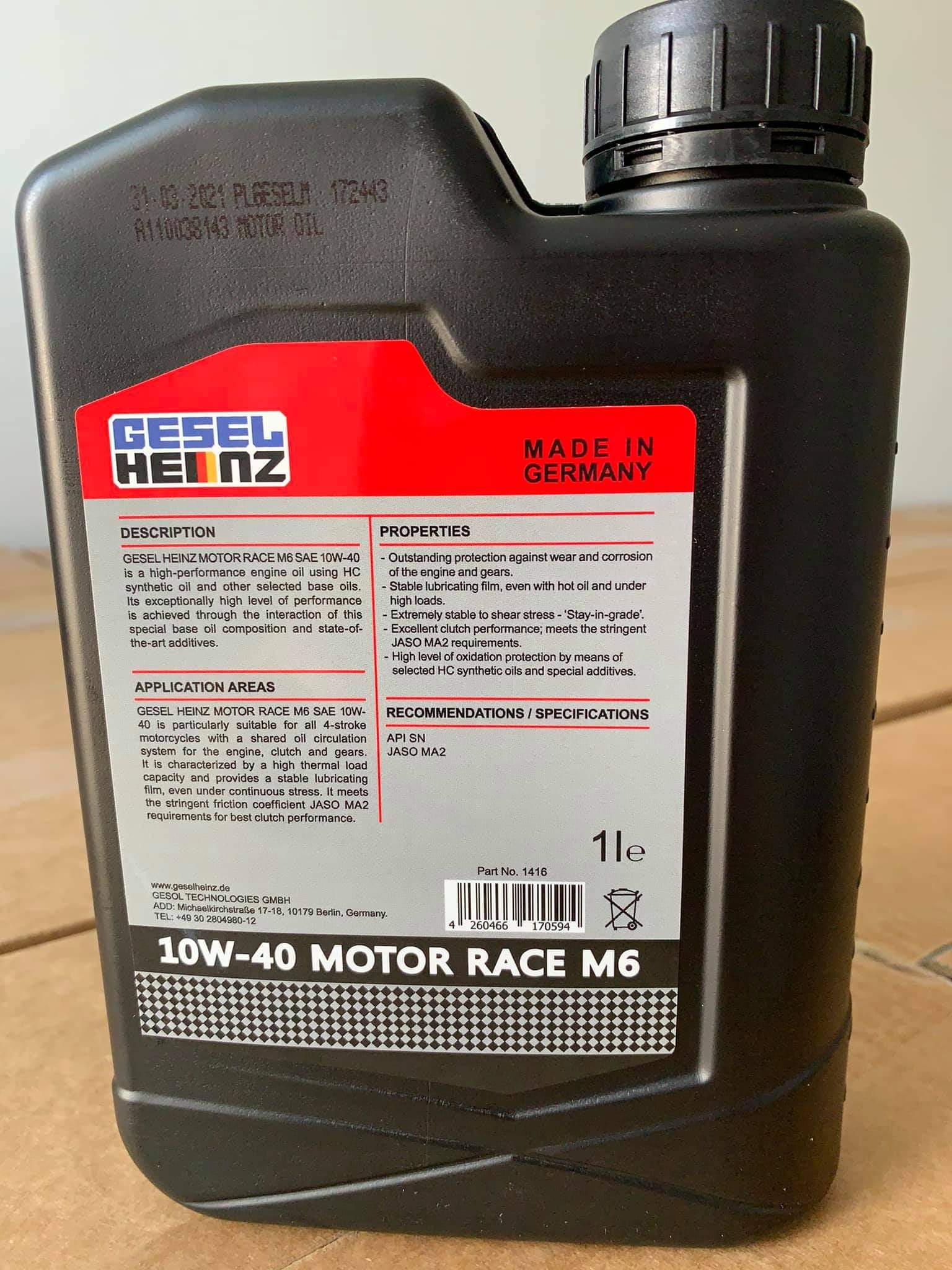 GESEL HEINZ MOTOR RACE M6 10W-40 is a high-performance 4-stroke motorcyle engine oil, using HC synthetic oil and other selected base oils in interaction with advanced additives. It shows a high thermal load capacity and provides a stable lubricating film, even under continuous stress. In so doing, GESEL HEINZ M6 meets the stringent friction coefficient JASO MA2 requirements for best clutch performance. In the areas of wear, prevention of deposits and piston cleanliness it even exceeds the requirements of the API SN specification. The oil change interval is extended.