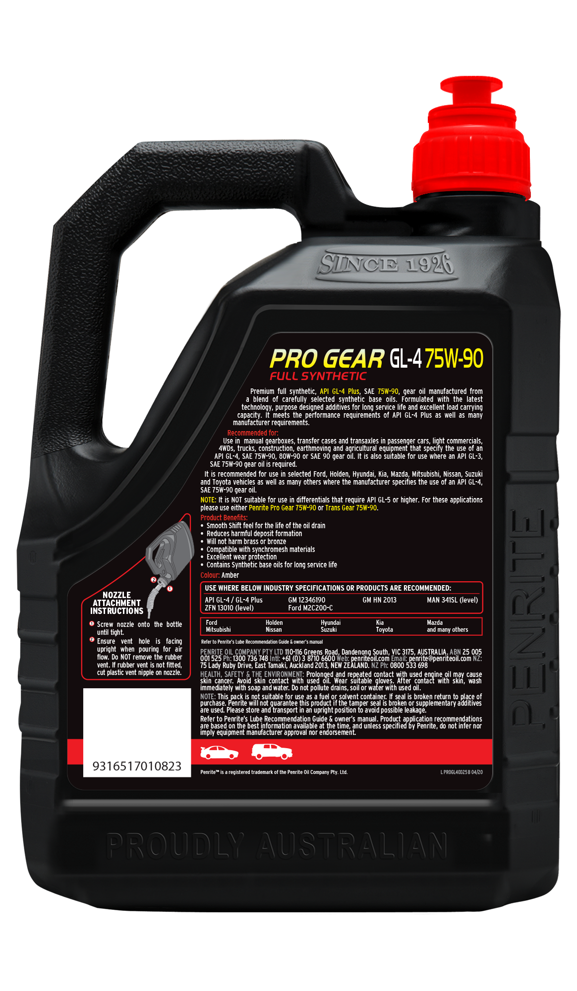 NOTE: Pro Gear GL-4 75W90 is not suitable for use in differentials that require API GL-5 or higher. For these applications please use either Penrite Pro Gear 75W90.