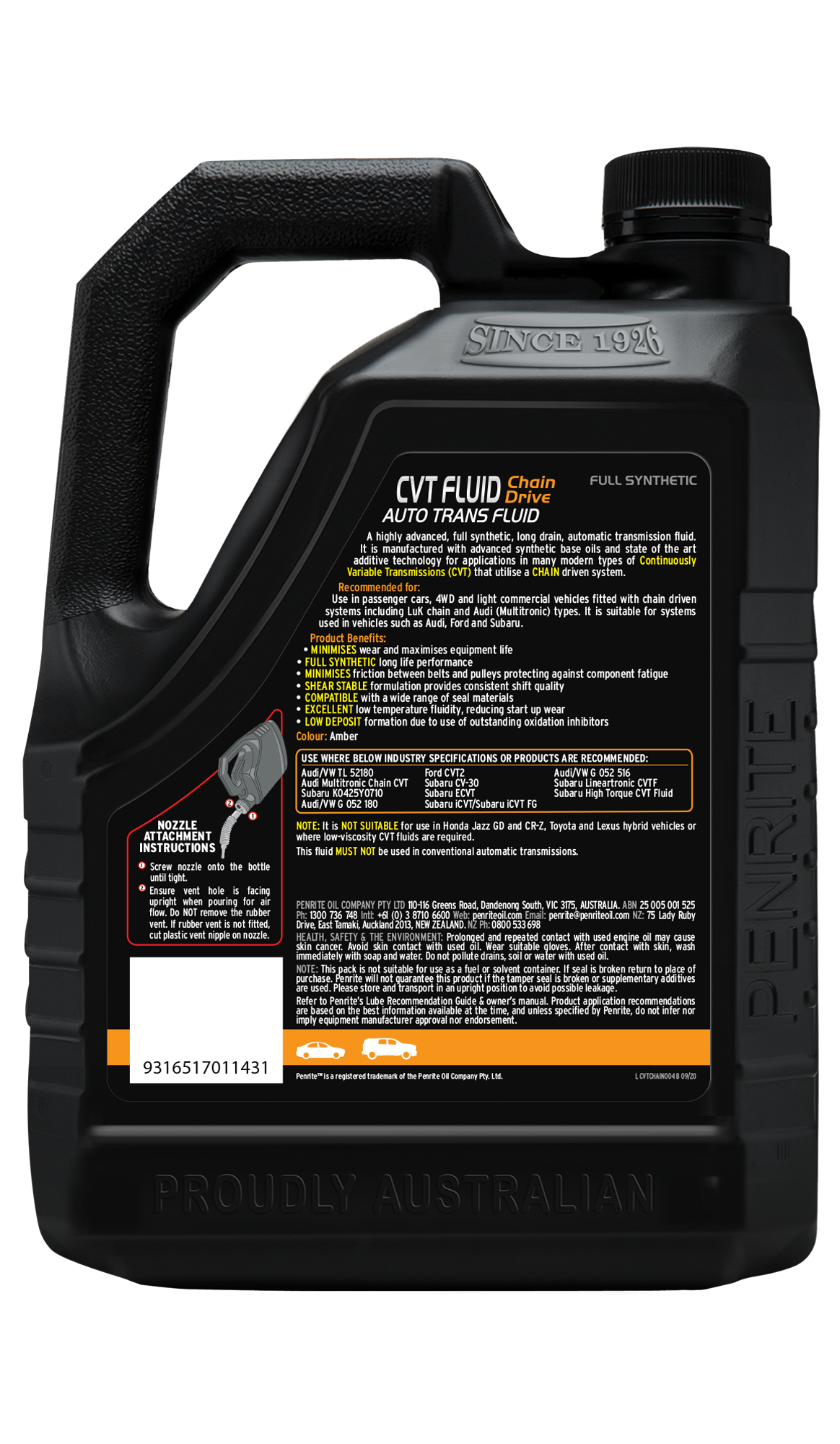 PENRITE CVT FLUID CHAIN DRIVE is a highly advanced, full synthetic, long drain, automatic transmission fluid. It is manufactured with advanced synthetic base oils and state of the art additive technology for applications in many modern types of Continuously Variable Transmissions (CVT) that utilise a chain driven system.