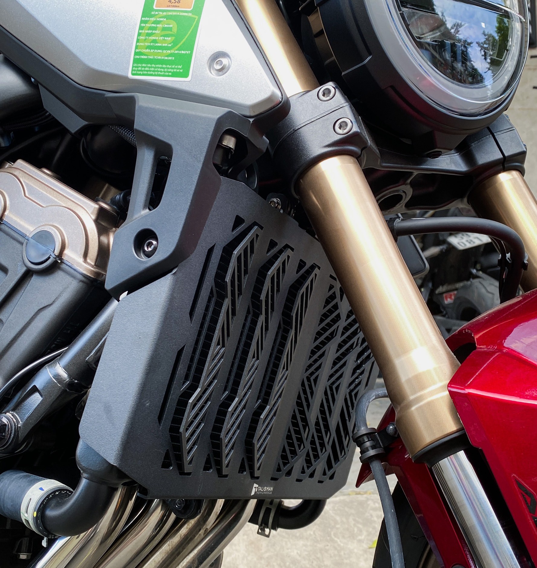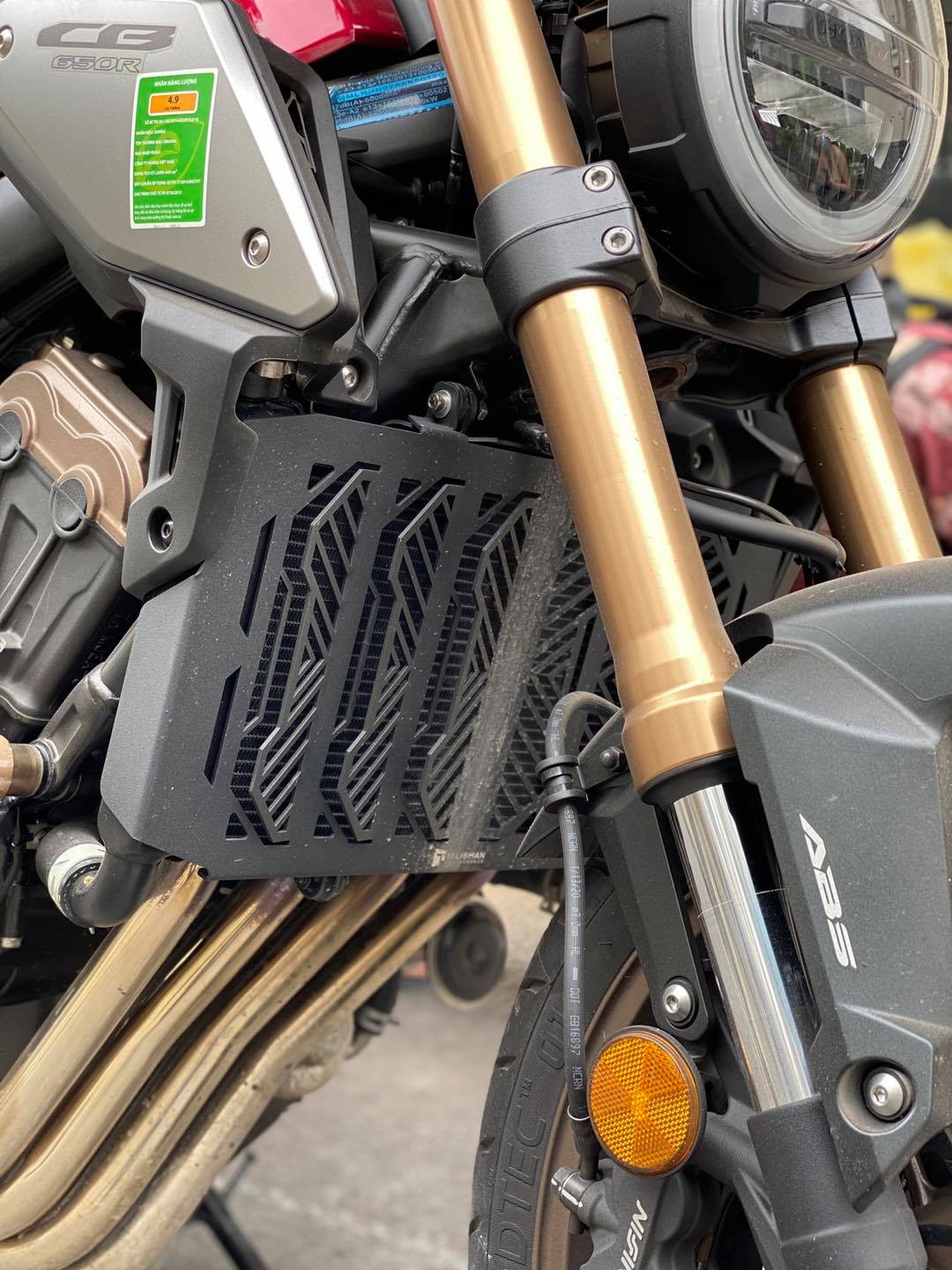 Che két nước Talisman Performance cho Honda CB650R có thiết kế thu gió tối đa giúp làm mát và ổn định nhiệt độ động cơ tốt hơn loại lưới thông thường. Che két nước Talisman được làm riêng cho dòng xe CB650R giúp việc lắp đặt dễ dàng, vừa vặn và không có tình trạng rung lắc phát ra tiếng kêu gây khó chịu. Bên cạnh đó, với nhiều sự cải tiến, che két nước Talisman không những bảo vệ hiệu quả tránh đất đá bắn vào gây móp, hư hỏng két nước mà còn hạn chế bùn sình, nước bẩn từ bánh xe trước bắn trực tiếp vào làm bẩn các lá nhôm. Qua đó thể hiện sự tối ưu trong thiết kế nhằm mang lại hiệu năng tốt nhất cho xe CB650R.