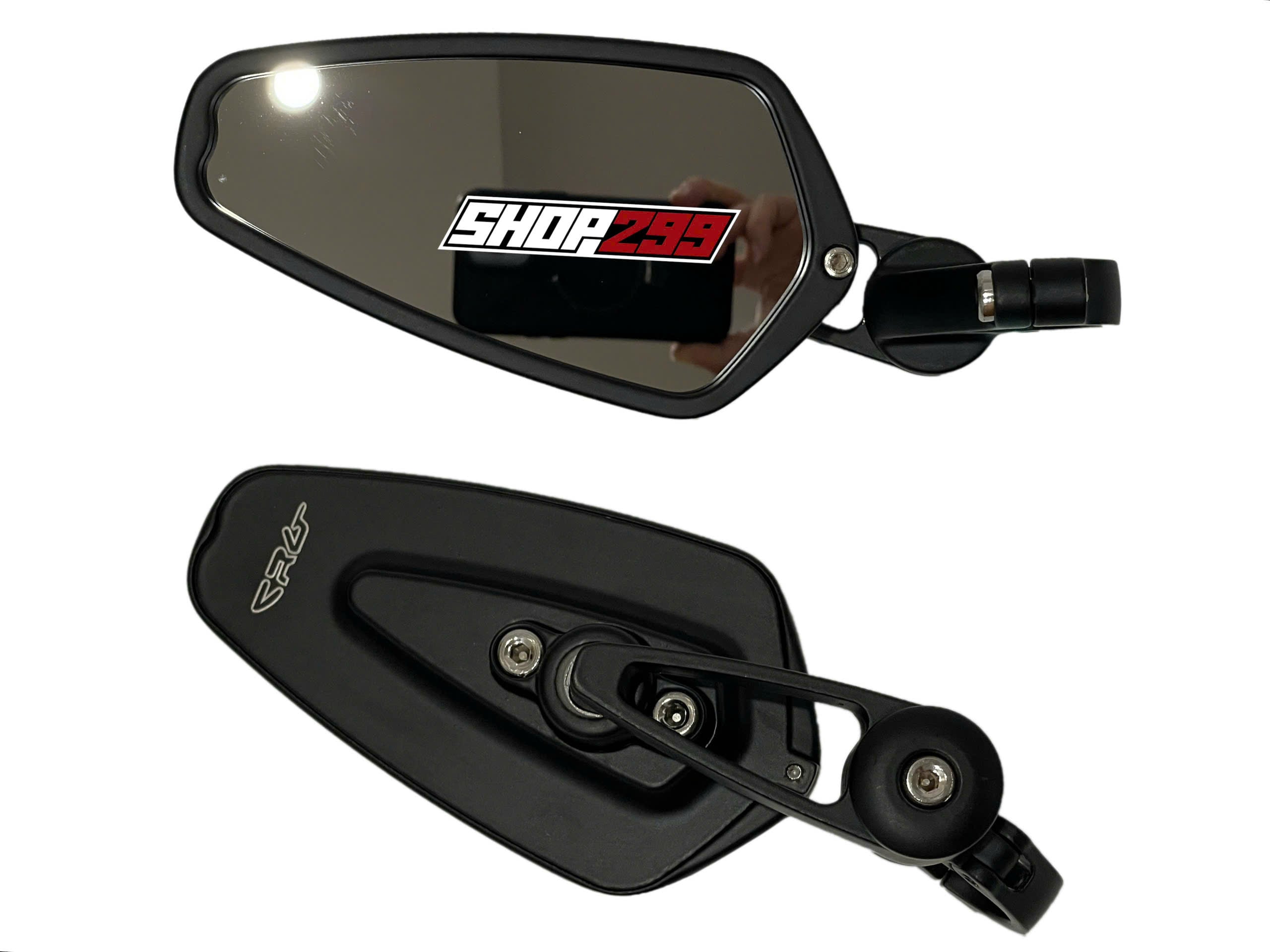 Gương gù CRG có thiết kế khí động học, mặt kính trong, phần khung vỏ nhôm đen mờ, sơn tĩnh điện có logo CRG in chìm.