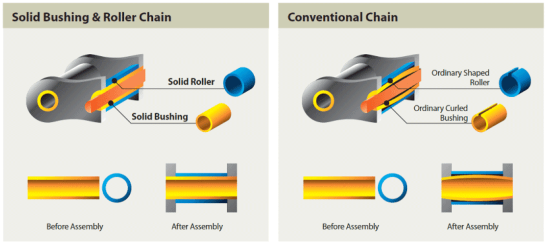 - Công nghệ Solid Bush dùng để chỉ trục con lăn của sên (bush) được làm nguyên khối, nhằm phân biệt với loại Curling Bush là dạng thép cuộn ghép mí.