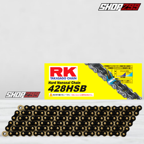 Sên RK 428 HSB có mắt ngoài đen mạ ED siêu bền, mắt trong vàng được mạ titanium nitrat, đặc biệt cả trục pin cũng được mạ. Sên RK 428 HSB 132L không phốt cao su là dòng sên cao cấp phù hợp với các dòng xe 150cc như Exciter, Winner, Satria, Sonic, Raider, Monkey,...