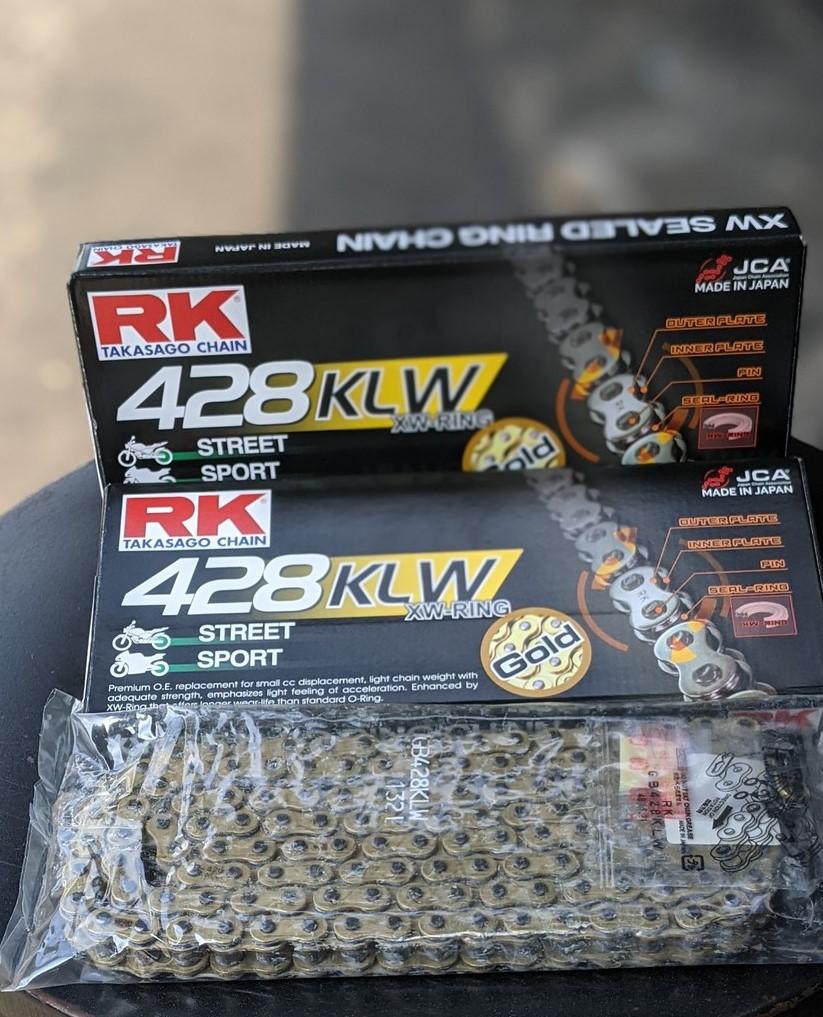 Sên 428 KLW màu vàng với phốt cao su cao cấp nhất XW-ring là dòng sên cao cấp nhất từ RK tại thị trường Việt Nam cho các dòng xe dưới 175cc.