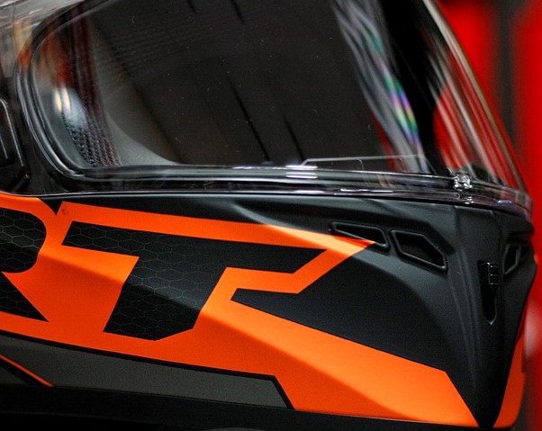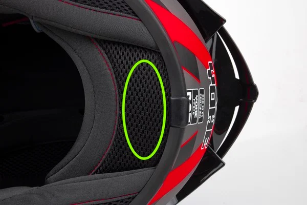 Phần cằm được gia cố thêm lớp vải đệm có thể tháo rời, có tác dụng cản gió cho người đội khi chạy tốc độ cao cúi người xuống để núp gió.