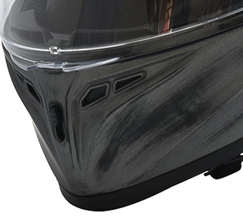 Phần cằm được gia cố thêm lớp vải đệm có thể tháo rời, có tác dụng cản gió cho người đội khi chạy tốc độ cao cúi người xuống để núp gió.